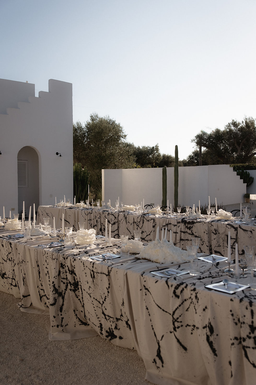 We wanted a place that felt like a contrast — raw light against our dark aesthetic. Puglia had that balance of minimalism and warmth, an openness that allowed us to bring our own mood into it. We spend a lot of time there when we miss Italy — it’s become our place to slow down, reconnect, and escape Berlin’s intensity. Some of our friends have homes there too, so it already feels a bit like our second world. We love the calm, the food, the sea — there’s a certain stillness that makes us feel instantly at ease. It felt natural to get married in a place that already holds so much of our life and energy.