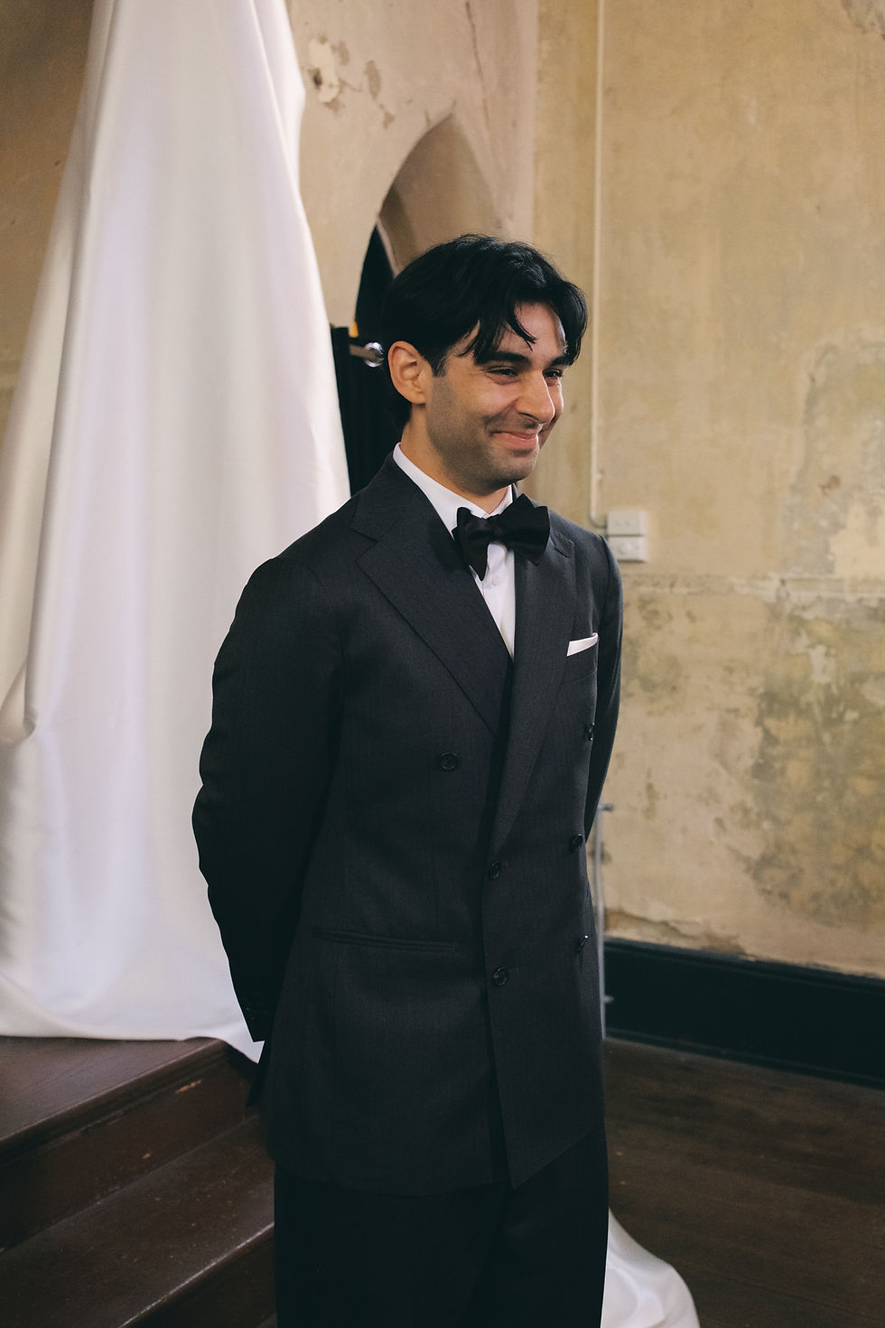Daniel: My suit was made by Oscar Hunt in Adelaide – a special thanks to Steven and the team at Norwood who executed the fit perfectly. It was an Italian wool, charcoal grey with a subtle herringbone pattern. Double-breasted jacket, with a single-pleated trouser. A crisp white shirt with matching silk pocket square, and a hand-tied black bow tie to bring it all together. Shoes were black leather derbies from Sanders – an English company still hand-making beautiful Goodyear-welt leather in the UK.