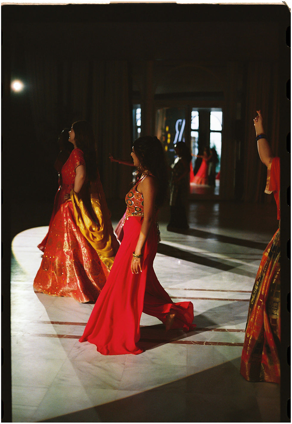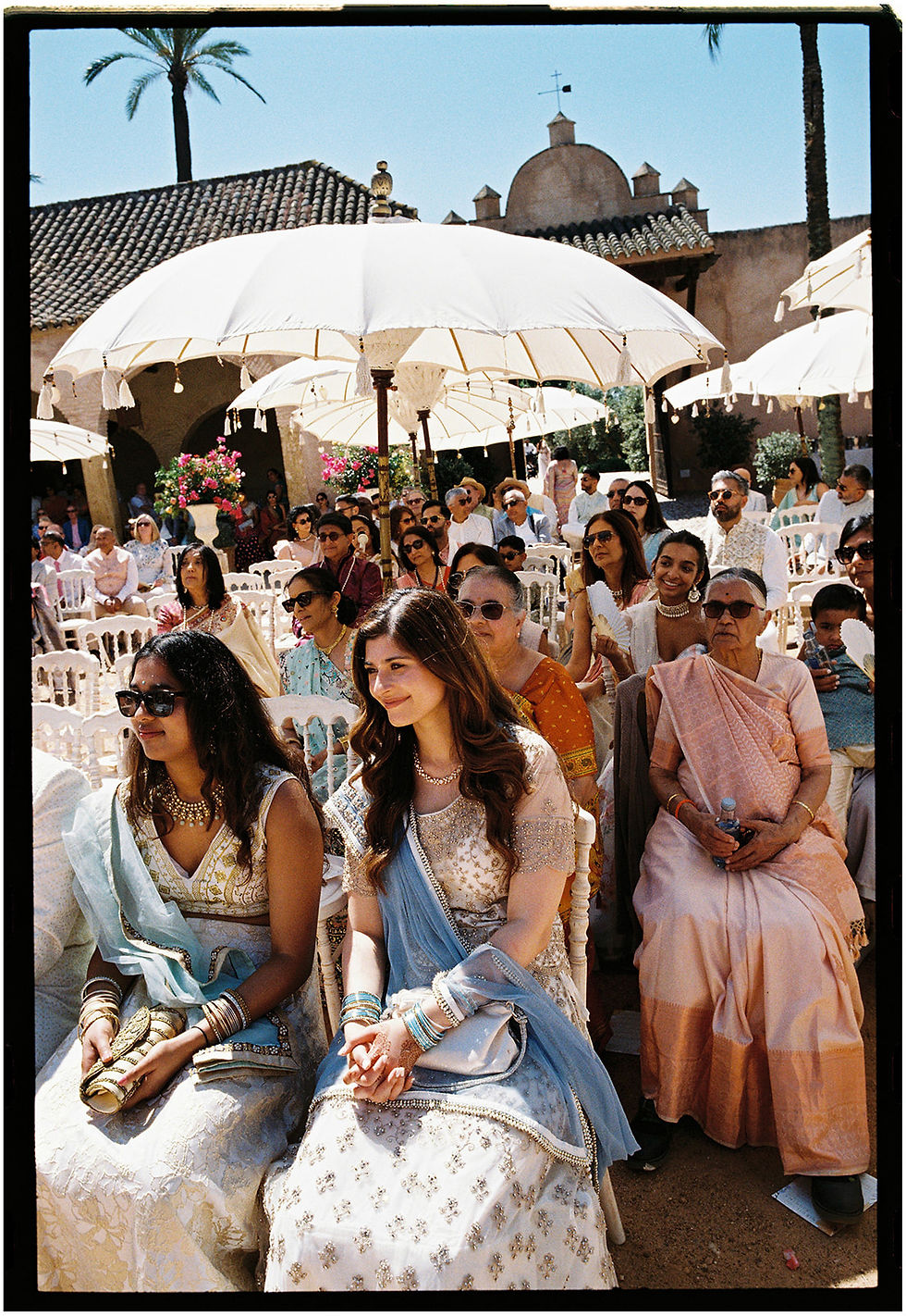 I spent two weeks in India sourcing outfits, with my bridal lehenga at the top of the list. I knew I wanted something that honoured my Rajasthani roots, and I’d always had one designer in mind: Marwar Couture. With that decided, my family and I braved the busy streets of Chandni Chowk—and by day one, I’d found the lehenga. It originally came with a red net and velvet dupatta, but the look truly came alive when I swapped in a burnt-orange net dupatta. Against the pink walls of Hacienda Molinillos, it became exactly what I had always envisioned, fulfilling my Rajasthani dream bridal look.